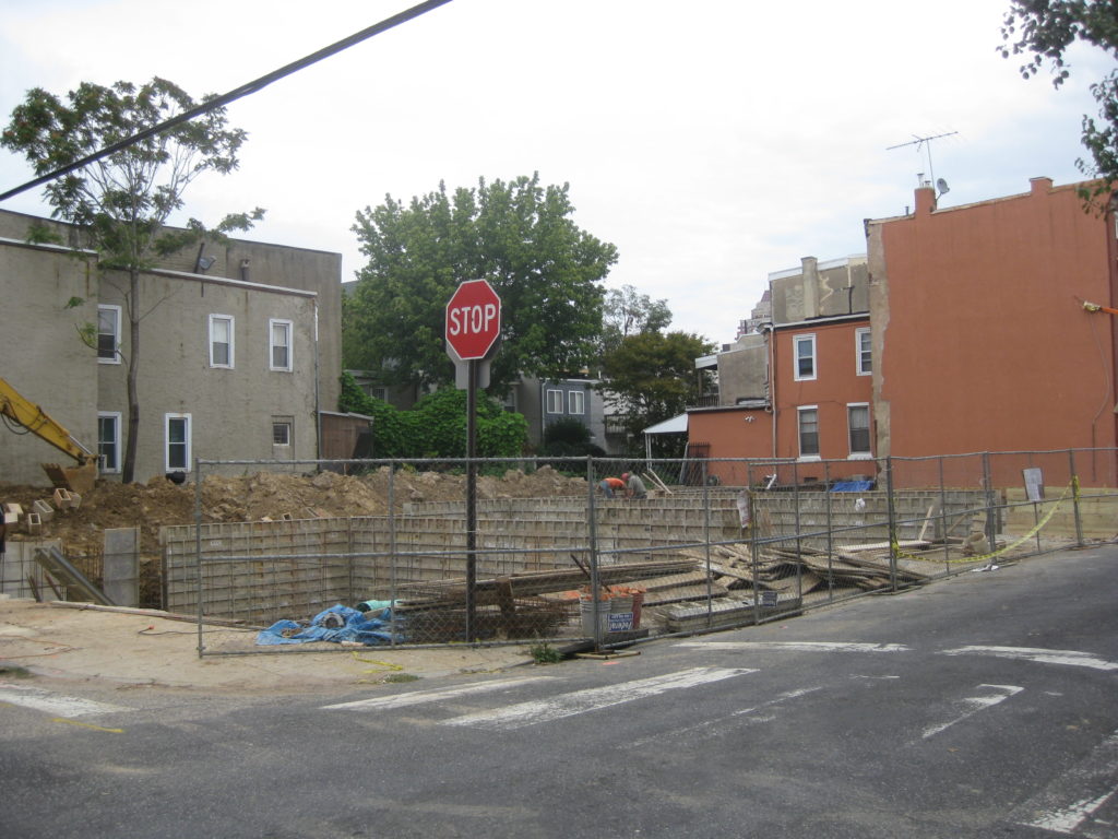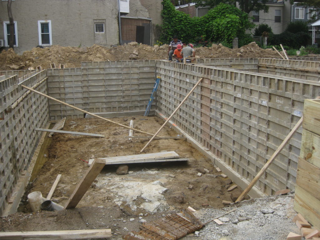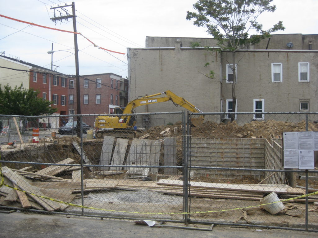 After the demolition was completed at 19th & Fitz, the lot sat more or less undisturbed for a couple of months, prompting a couple of readers to reach out and ask if the project was perhaps stalled out. We assumed that the developer was simply working to finish the project a block away before committing any more energy to the construction on this site. And with the recent completion of the 20th Street homes, we’ve finally seen action here once more. Last week, we noticed the land being leveled at the bottom of the pit that was left after demo. Today, we swung by and took note that foundations will probably be poured by the end of the week. Footers are in, and form work is surrounding rebar springing from half of them. Take a look: