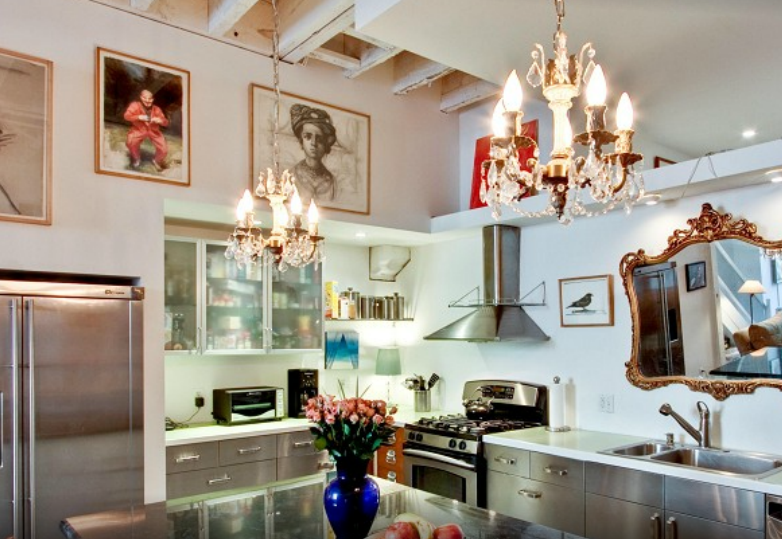 The three-bedroom three-bathroom 20-foot-wide home at 2312 South Street is unfortunately no longer on the market (it was sold for $780K). The open and airy townhome has 12-foot ceilings (which are actually utilized and highlighted with high-hung art), floor-to-ceiling bookcases, an artists’ studio and separate north and south roof terraces. Right near the Graduate Hospital triangle near Grays Ferry and the South Street bridge, the large wooden garage door makes the 2,840-square-foot listing stand out from its neighbors. The interior is equally spectacular, with rustic exposed beamed ceilings and details (vintage mirrors) juxtaposed with sparkly chandeliers (a great way to change the blah look of a kitchen). A recessed fridge area and high shelves utilize the large space without making it seem empty or boxy. —Caitlin Connors