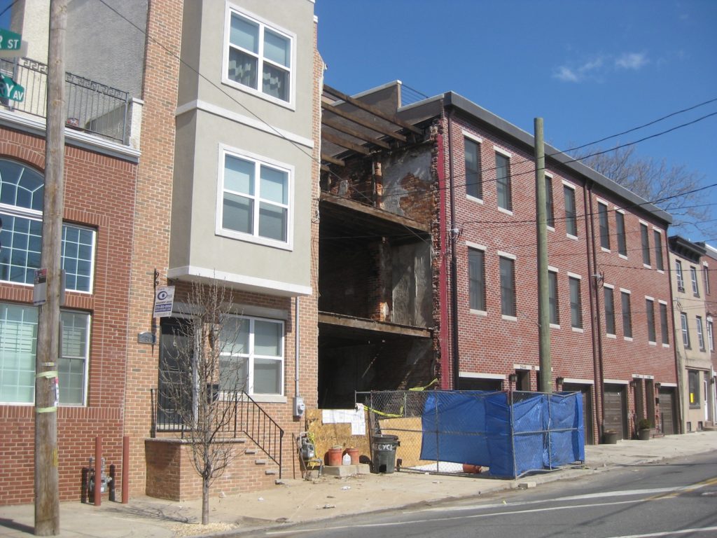 Three doors down from this project, at 2546 Grays Ferry Ave., we spotted the facade has come down. In between the two properties is an attractive home with a shape you rarely see in this town, and another newer home that's got a much more standard look.