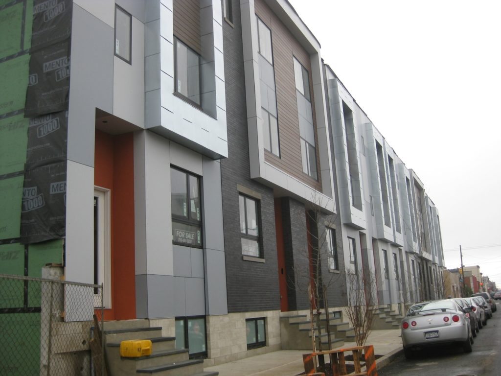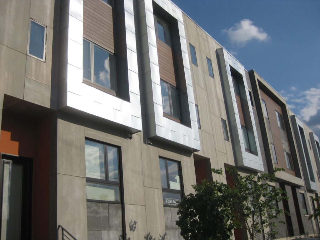 According to the developers, the homes were originally sheathed with CertainTeed panels, a product that had a fundamental flaw that caused warping and cracking. The manufacturer had to deal with a class action lawsuit as a result of this defect. So those have been scrapped. The homes are now covered in a product called Viroc which doesn't have the same problems as its predecessor. It's thicker, sturdier, and in our opinion looks nicer. With over half of the homes in the development sold, perhaps the new facades will bump up interest in the coming months. And when the corner is finished, that won't hurt either.