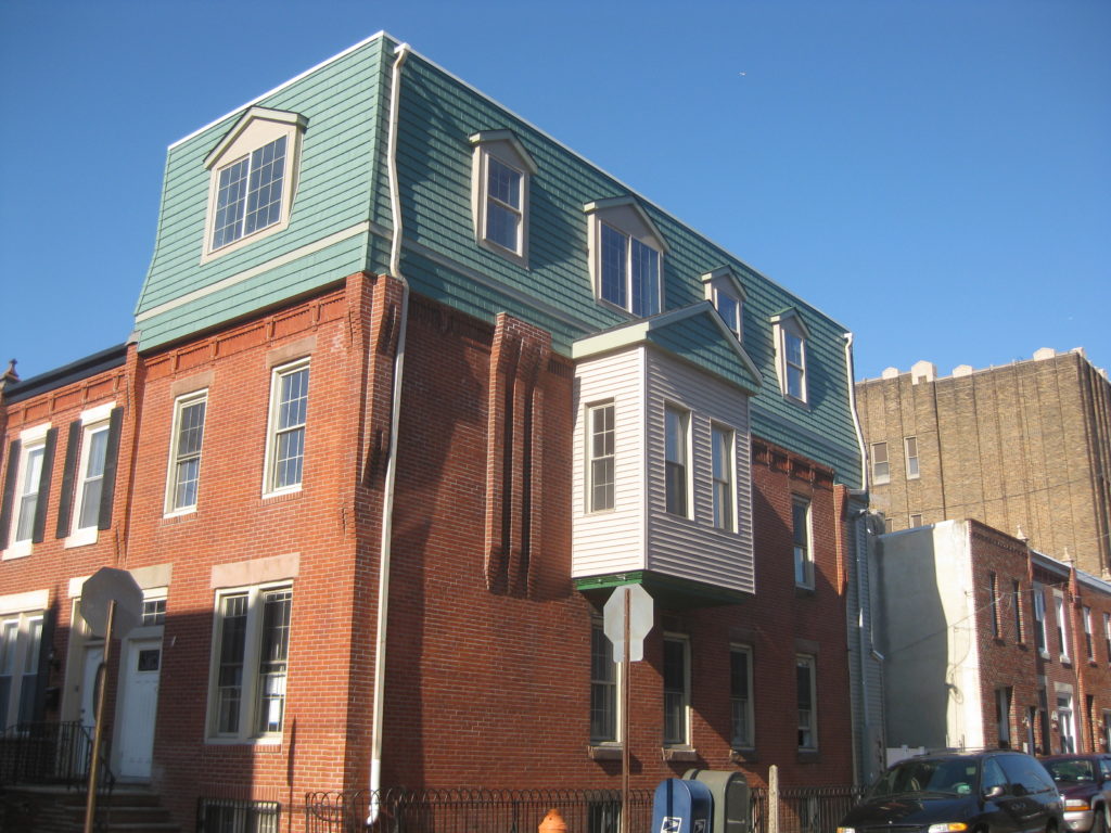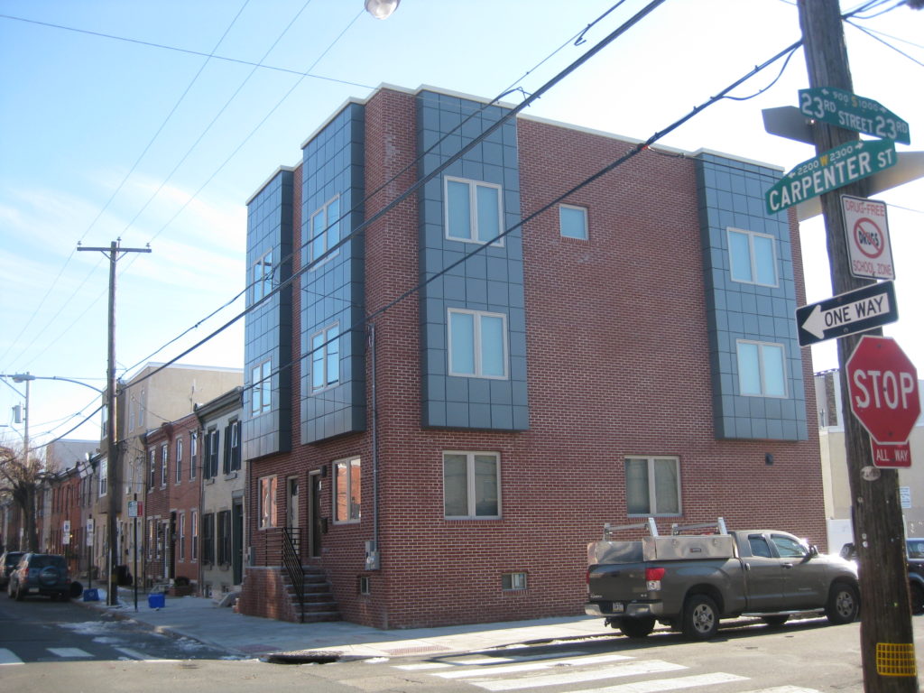 On the northwest corner of 24th & Carpenter, a new addition recently appeared. We have no problem with the third floor on this building, and in fact appreciate the effort to distinguish the new part of the structure from the original. But we have to wonder, why were these the materials that were chosen? The first two floors look like an attractive Philly row home, the third floor looks like a shore house. We would have to imagine that the folks who designed the addition were looking at the building right across the street for inspiration. But was that really an appropriate source? Sure, this is just a minor aesthetic detail in a giant city- but even to the untrained eye this was a questionable choice.