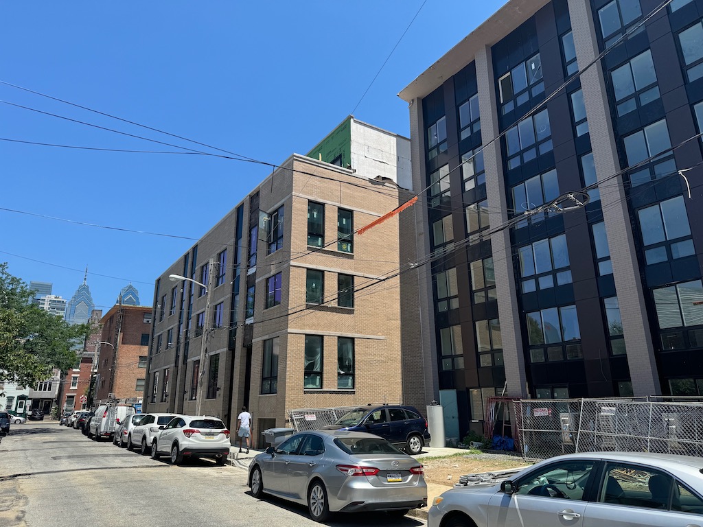 Meanwhile, the 20-unit addition on Fitzwater Street also looks finished, at least from the outside. Speaking of exteriors, the southern apartment building on the site has experienced a significant facelift as well, swapping a 1960s-era facade for a very 2020s-era paneled look. A sign out front indicating that units are available for rent would seem to suggest that any interior renovations are done.
