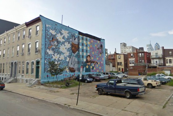 On Thursday, a reader gave us the heads up about a mural either being repaired or removed at 1419-23 Christian St., a vacant lot owned by the nearby Ebenezer Seventh Day Adventist Church. With no homes on the eastern side of this lot, this mural was clearly seen by everyone traveling west on Christian Street. And not for nothing, it was a pretty interesting, attractive mural.