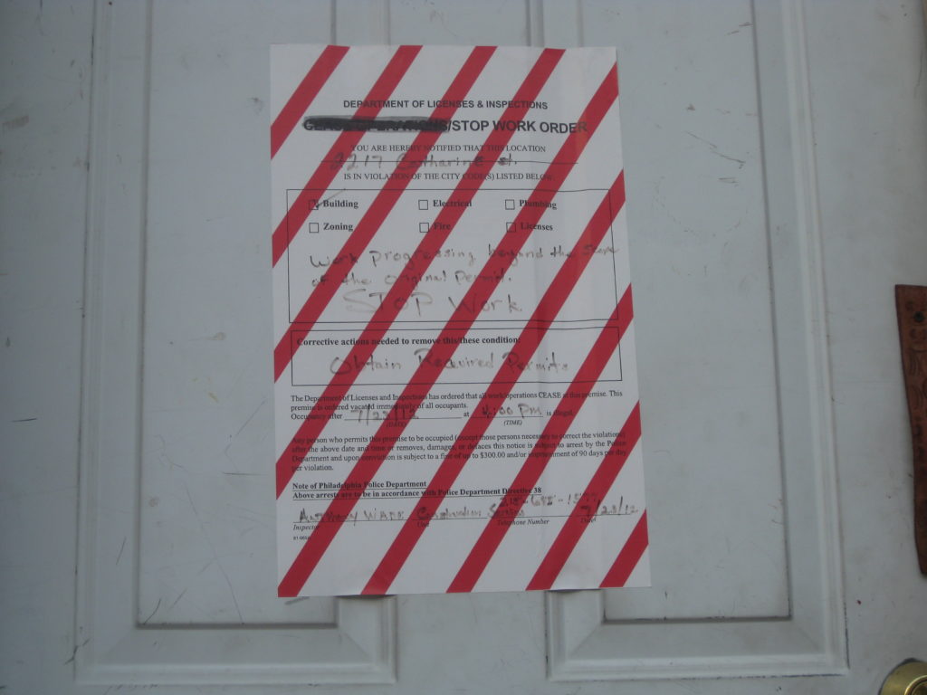 The photo above was shot a couple of days ago, and the L&I website indicates that there are still a couple of violations on the property that have not been cleared up. Meanwhile, the neighbor has heard that the same developers have purchased 2225 Catharine St., the property a few doors down. While we can see that it’s been sold, public record hasn’t recording the deed yet. Hopefully, the next project will involve subcontractors who will be more careful, and crews that will wait for appropriate permits to do construction.