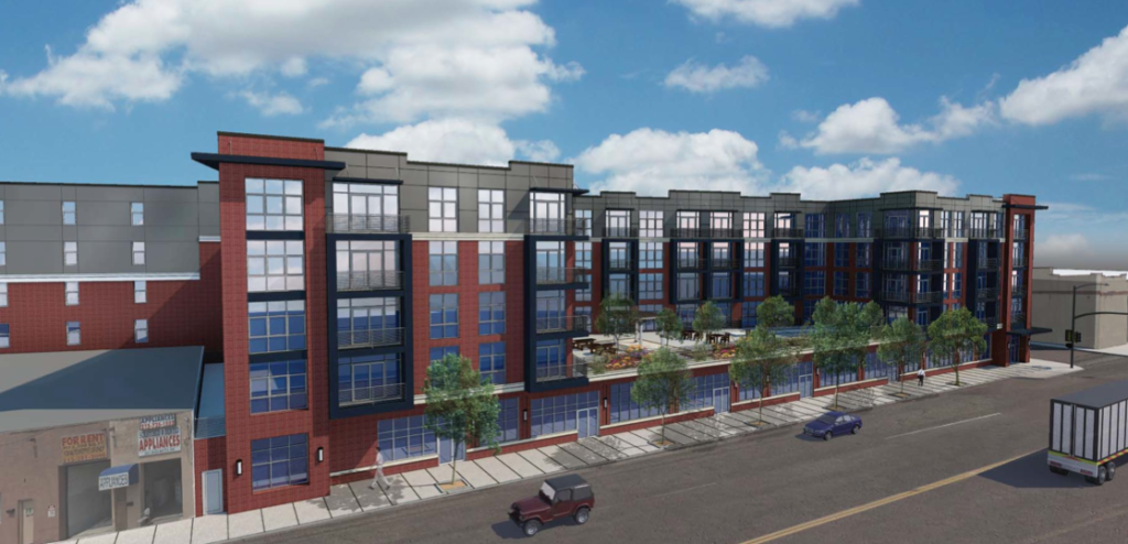 At last night's meeting, representatives from the developer presented slightly revised plans and showed some renderings with additional details. The notable change to the project is the extension of the commercial space to the west at the expense of some of the project's parking spaces. A good trade-off in our estimation, though we'd have liked to see the commercial space anchor the corner instead of the middle of the block.
