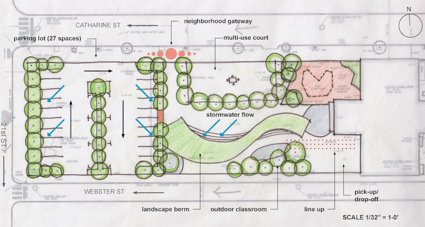 Clearly, each of the concepts have different things going for them. The first concept has a second play area, which would make all the kiddies in the neighborhood really happy. Concept B has an outdoor classroom space and a cool landscape berm feature. And the final concept has a great entrance at the corner of 21st & Catharine, welcoming the community into the schoolyard.