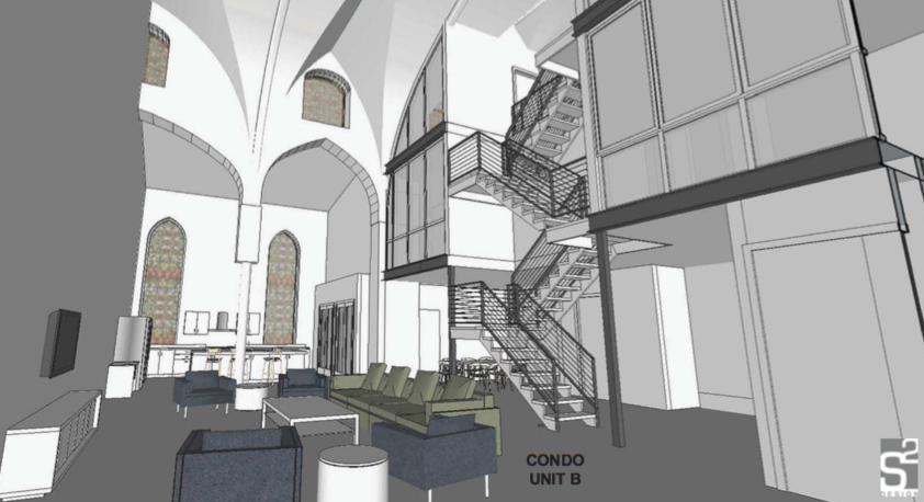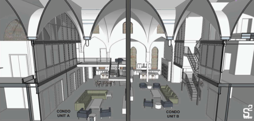 The brownstone facade of the former rectory is being restored and the building will be converted into a single-family home. Next door, the former church will be split into a daycare facility that will serve up to 100 kids and two unbelievable condo units in the sanctuary space. As for the parking lot, the plans call for a five-story, eight-unit condo building with parking on the first floor. Architecture work was done by the husband and wife team Christopher and Emily Stromberg of S2 Design.