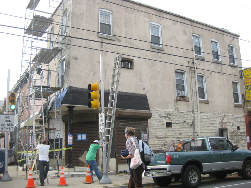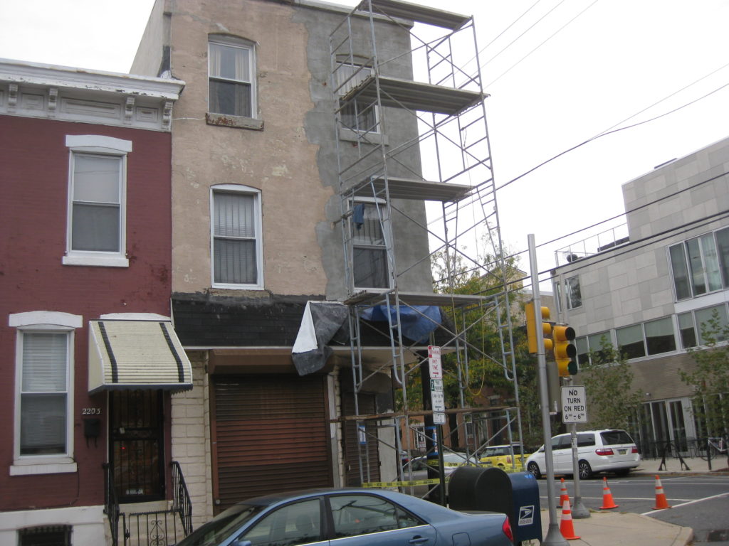 To sum up, two corners of this intersection have been transformed and there are rumors that the same will happen to a third. This being a normal intersection in Philadelphia, there’s one more corner to discuss, and that’s 2201 Catharine St., the northwest corner. For years, this corner has looked awful. Of late, we’re fairly certain that the Chinese take-out place has ceased operations. But we haven’t heard any news about the building nor have we seen any efforts to make it better. That is, of course, until yesterday.