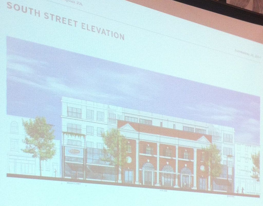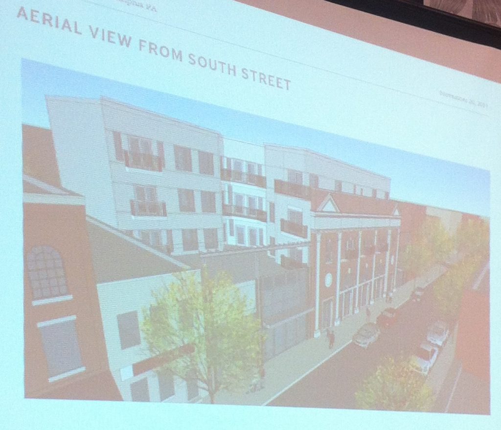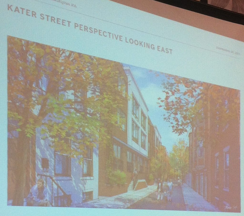 On South Street, a setback structure will surround the existing facade, adding density but allowing the original facade space to breathe. On Kater Street, The rear of the building will look like three-story row-homes from the sidewalk, but there will be a fourth story that's set back ten feet from the three-story section. Here, check out these kind of grainy renderings, snapped at the meeting: