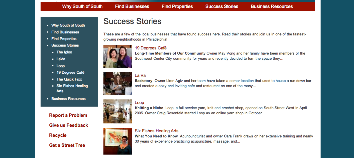 Then there's a collection of success stories from business owners who have made a go of it in the neighborhood. And finally, for someone who wants to open a business in this neighborhood or any other, there are links to different resources for opening a business in Philadelphia.