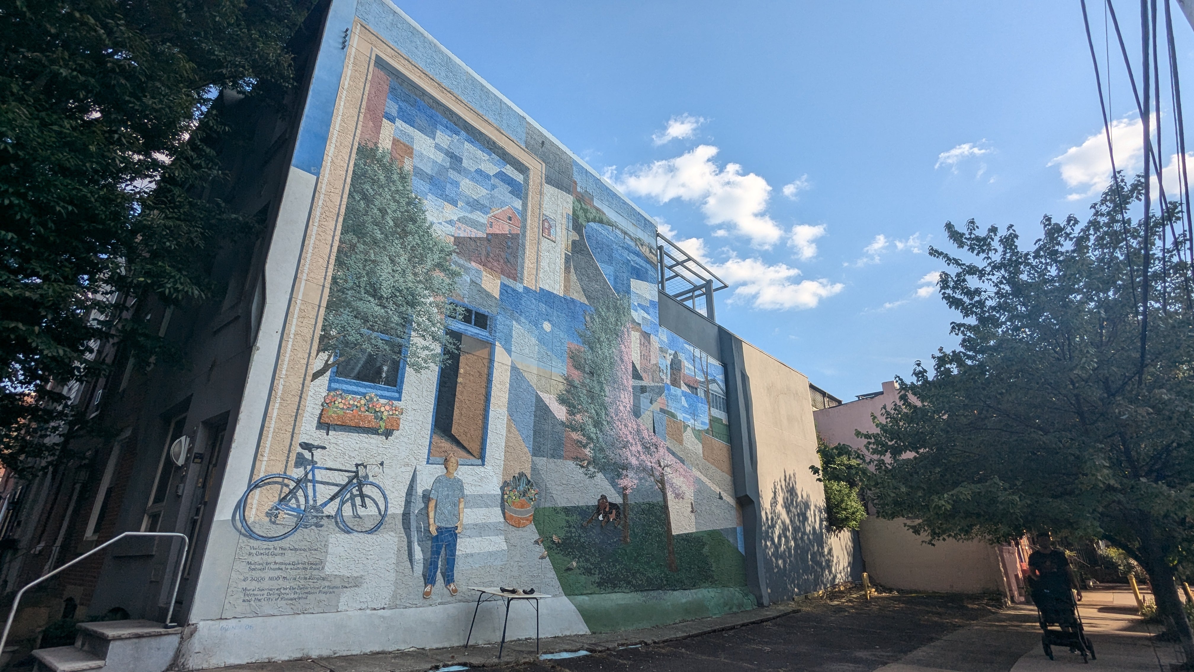 Welcome to the Neighborhood is a mural by David Guinn at the bottom of the South Street Bridge, at the corner of 27th & South. This mural was painted in 2006, when the surrounding neighborhood was very much in transition and nearby Naval Square was only in the early stages of its transformation into a gated residential community. The mural is and was highly visible to drivers, cyclists, and pedestrians making their way off the bridge, welcoming them to the neighborhood in a far classier fashion than they do in say, Las Vegas. But it seems that the experience of entering the neighborhood is likely to change in the near future, as the mural is going to be a casualty of a new project planned for this corner.