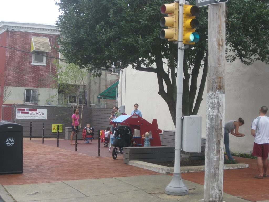 If you’ve passed by 22nd and Catharine Streets any time recently, you’ve surely noticed that change is afoot at this corner. As we told you about a few months back, SOSNA has spearheaded an effort to transform a fenced-in corner lot into an attractive little public green space called Catharine Park. Local landscape architects Composite Inc. have been hard at work over the past few months, repaving the lot with permeable pavers, installing new planters, and creating a play area for young kids.
