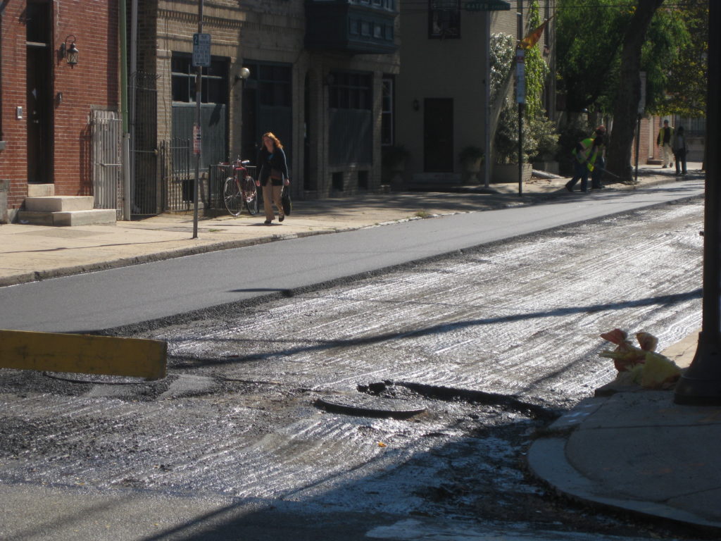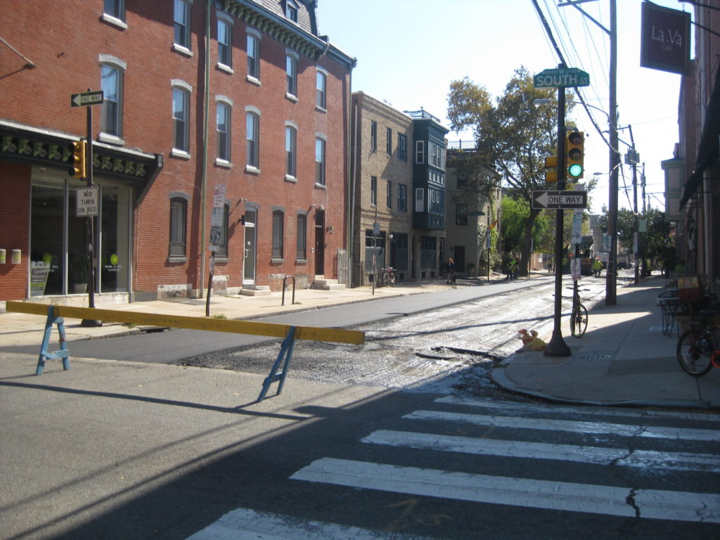 Don’t ask why, but we were in the area today and came to the wonderful realization that 21st Street is being paved at last. You may recall, a water main break back in July has closed the 21st & Bainbridge intersection to vehicular traffic, which has created snarled traffic on South Street for months on end.