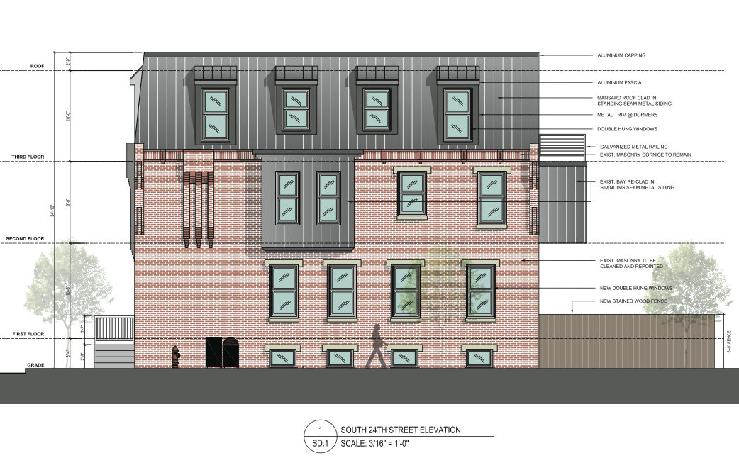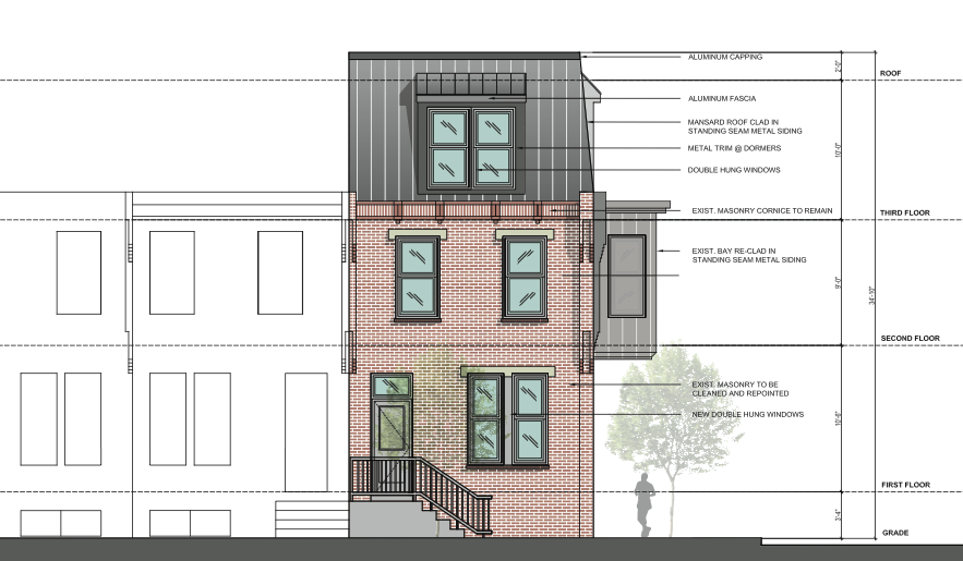 At last night’s SOSNA zoning meeting, representatives from Harman Deutsch presented plans for 2401 Carpenter St. to the community. Their proposal was to build an addition to the existing two-story building, and offer three condo units for sale in the renovated building. Looking at the structure today, it has some lovely bones. And looking at some old listings for the property, it looks like it has some nice original details inside as well.