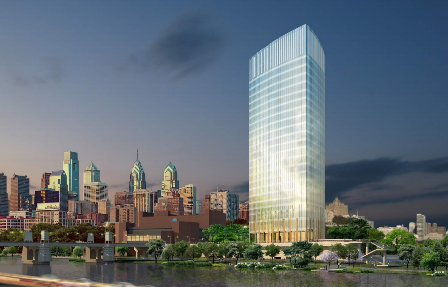 In case you don't remember, the current construction is for the first of four buildings planned for this site. That 23-story office tower will be joined by a promenade at the South Street bridge that leads to an extended Schuylkill River Trail, a large public green space on Schuylkill Avenue that leads to views of the river, and a couple of retail spaces. There will also be parking for 500 cars. The building, designed by Pelli Clarke Pelli and Cooper Robertson & Partners, will look like this: