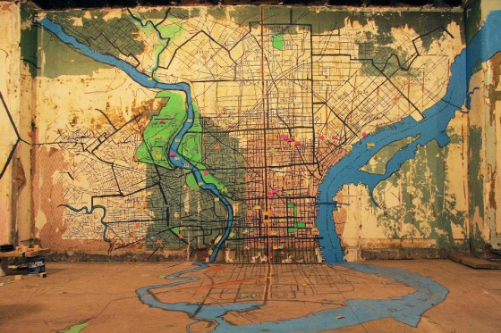 As we mentioned yesterday, the building’s owner allowed BetterBlocks Philly to use the vacant space back in October. The first floor was largely used to coordinate the setup of various projects on the street for BetterBlocks. Upstairs hosted a couple of events, including a Philly Works sponsored art installation of which the mural was one of the subjects. The Philadelphia Map Mural was created by local artists Shira Walinsky & Adam Carrigan, and for a short time, it brought new life to this vacant space.
