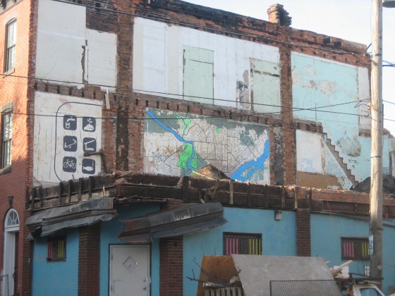 Commenter G-ho Res gave us the heads up about an impressive mural that’s been revealed with the complete demolition of the 3rd story of 1801 Christian St., a subject we wrote about yesterday.