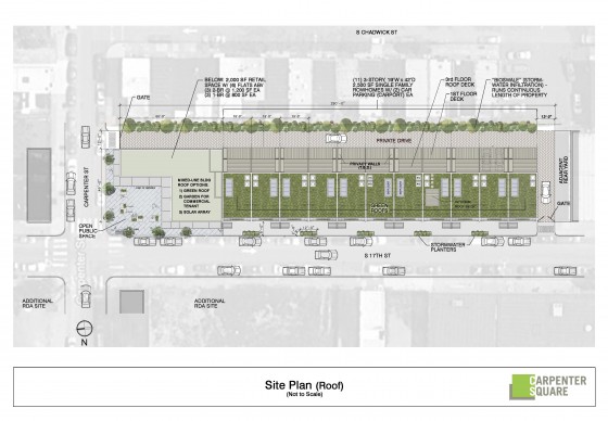 Carpenter Square will have an enviable number of green features, with stormwater management taking a prominent role in the plans. The homes themselves will be LEED certified, and the developers hope to gain LEED certification for the development as a whole, as well. All of the homes will have large green roofs. The plaza will have permeable pavers and will, along with the streetscape in front of the town homes, include stormwater planters, which handle runoff from both the buildings and the street. Most interesting is the bioswale, a constructive vegetative buffer with a drainage bin, that will run the entire eastern property line of the project.