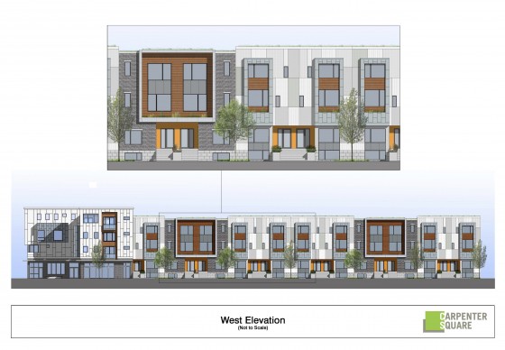 Carpenter Square will feature 11 town homes, a mixed-use building on the corner with an L-shaped commercial space below six condos, and a courtyard in front of the commercial space that’s open to the community. The town homes will each have two-car parking. Take a look at some renderings.