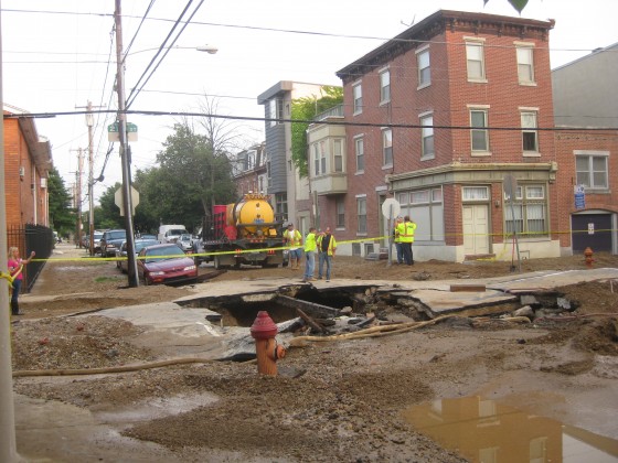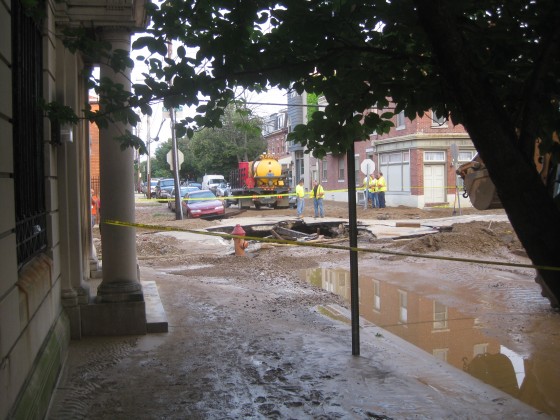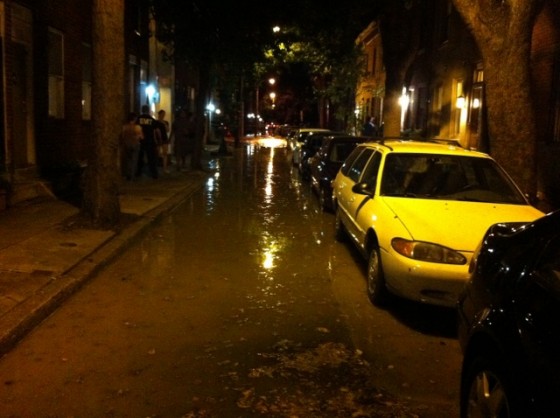 Around 9pm last night, a 48-inch water transmission main broke at 21st & Bainbridge. The results of this were dramatic, with a torrent of water rushing out of the ground for hours, resulting in a river on 21st Street. According to some of the firemen on the scene, the intersection looked like a volcano had erupted, and the surrounding street was beginning to deteriorate, thanks to the rushing water. These men then had to run off to evacuate a family in a boat.
