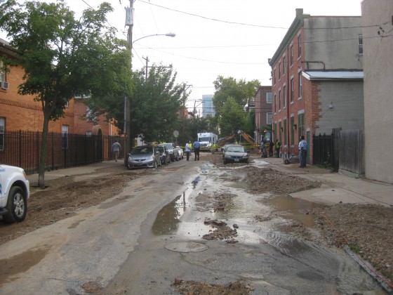 Trucks attempting to clean up the mud at 21st and Fitzwater Sts.