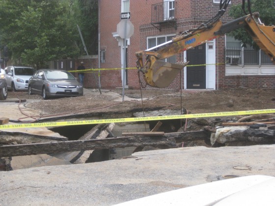 The street surrounding the broken main (which got shut off at some point last night) is totally destroyed. A policeman on the scene called it a sinkhole, which seems like a pretty apt description.