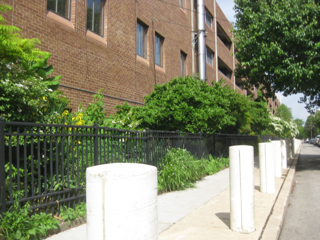 Such is the case for the parking garage located at 1700 South Street, which is used primarily by employees and patients of Penn Medicine Rittenhouse, a facility that occupies several former Graduate Hospital buildings. No one would make the argument that this building is anything but ugly- but it does offer one unusual and unexpected feature that stands out as a redeeming quality. Directly behind the building is a block-long green space on the 1700 block of Kater Street.
