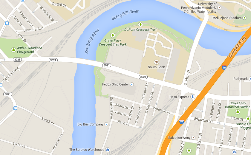 Just south of the South Bank campus is the Forgotten Bottom neighborhood, which we've mentioned a handful of times in the past. It's tucked between Grays Ferry Ave., I-76, and the Schuylkill River, and it's pretty easy to miss. Along with a few hundred homes, the neighborhood has a newer baseball field, a large FedEx building, and the entrance to the underutilized Dupont Crescent section of the Schuylkill River Trail. This neighborhood, which has seen little change in recent years, will soon be experiencing an unprecedented amount of development.