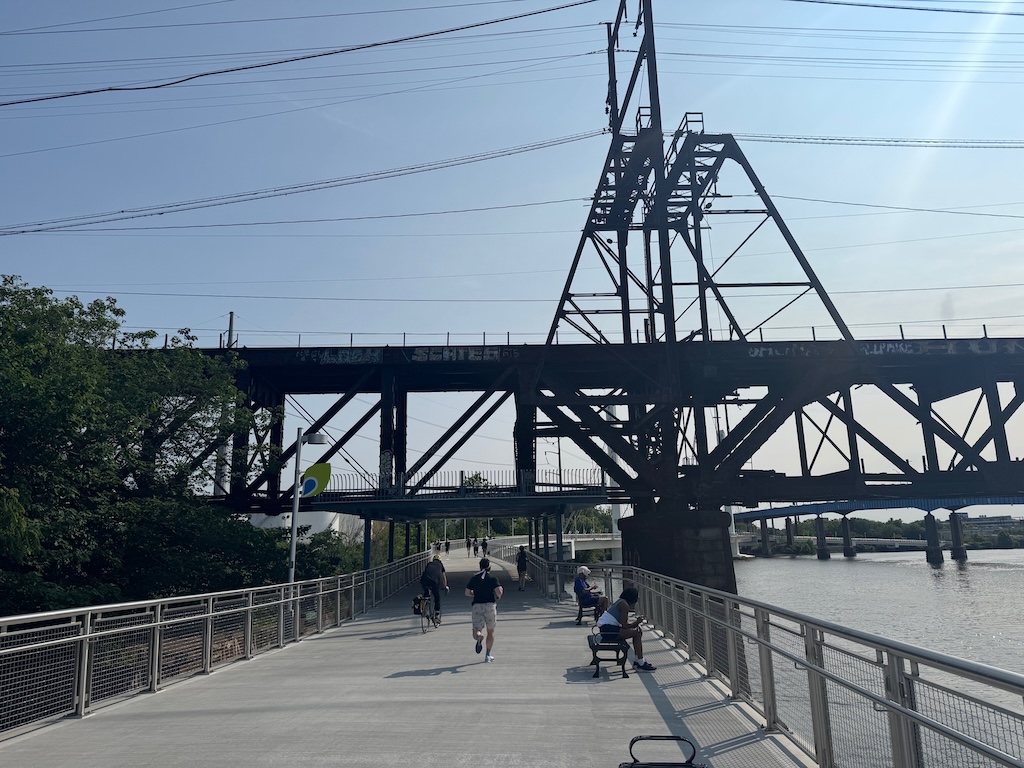 The trail runs along the river, offering a path for pedestrians and cyclists who want a more serene route from Center City to the north. The green space alongside the path is wonderful for picnics, yoga classes, and for kids to run around in grass. For close to 15 years, the trail ended at Locust Street due to the topographical challenges to the south. It was finally extended to South Street via a boardwalk in 2014, and then to Christian Street in 2018.