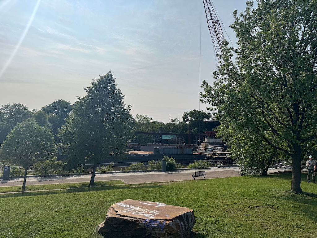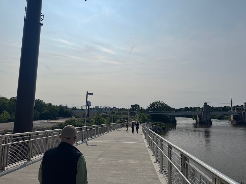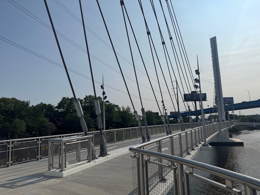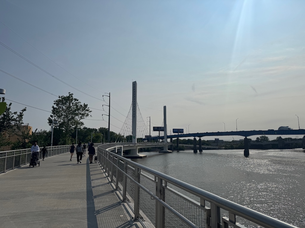As was the case between Locust and South Streets, a boardwalk was necessary to bring the trail into the river itself. New this time around was the inclusion of a cable-stayed suspension bridge which provides a striking aesthetic component to the new section of the trail. The bridge was necessary for engineering purposes which are frankly above our pay grade, but definitely provides the Christian to Crescent section of the trail with a unique showpiece that can been seen from I-76 and the University Avenue Bridge.