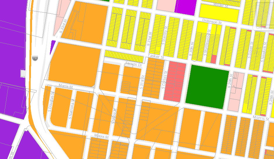 This could be due to the fact that many of these properties currently contain affordable housing units, built by PHA, and it could also be related to the fact that this area hasn't been remapped in decades. Since this part of the neighborhood doesn't see much development it's not a huge problem, but for the folks interested in building something at 3229 Tasker St. it certainly created an issue. The developers wish to build a commissary and catering space, which makes perfect sense based on the location. But because the zoning is outdated, they needed to go before the ZBA, adding time and expense to their process. Thankfully, they received approval from the ZBA last month- but if the property were properly zoned it's likely they'd already be under construction.