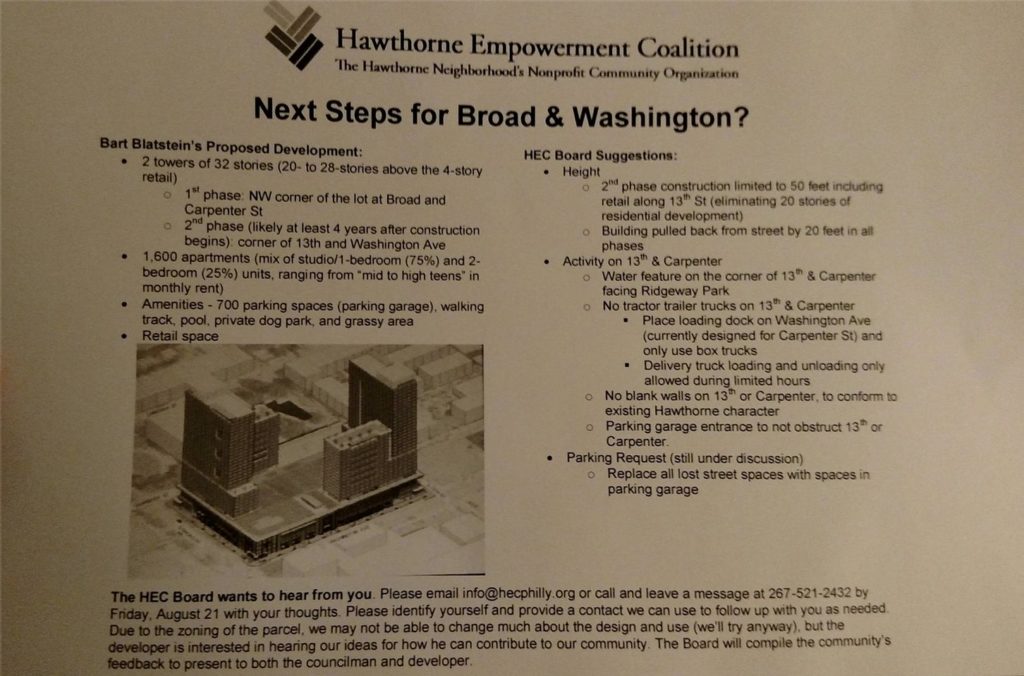 We were so excited to attend the Hawthorne Empowerment Coalition meeting last November where developer Bart Blatstein presented his plans for the long-vacant lot at the northeast corner of Broad & Washington. We can't say we expected the project would be in the ground by now, but we were at least hopeful. Alas, the property still sits vacant, as it has for so many years.