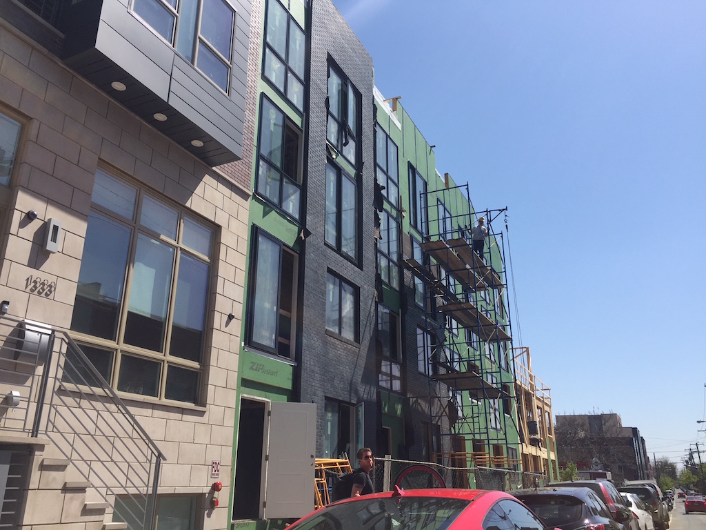 Way back in the summer of 2012, we told you about plans for twenty-two homes on the 1300 blocks of Bainbridge and Kater Streets, on a parcel that had been used as a surface parking lot for quite some time. The project caught us off guard at the time, as we openly wondered whether buyers would be willing to pony up top dollar for high-end homes next door to a gas station. But life is full of trade-offs, and buyers were indeed interested in these homes because of the generous square footage, the two-car parking, and the desirable location, suboptimal neighbor notwithstanding. Within a couple years, the first phase of the project was well underway, with the first homes going under contract at prices exceeding $1M. And then things got weird.