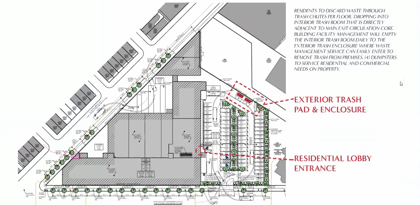 Much of the hearing was dedicated to addressing how the property will deal with the trash produced by the new tenants, as well as clarifying how the residents will access their apartments above the ground floor. The updated proposal also clarifies the project will include 55 surface parking spots, accessible off Kensington Avenue.