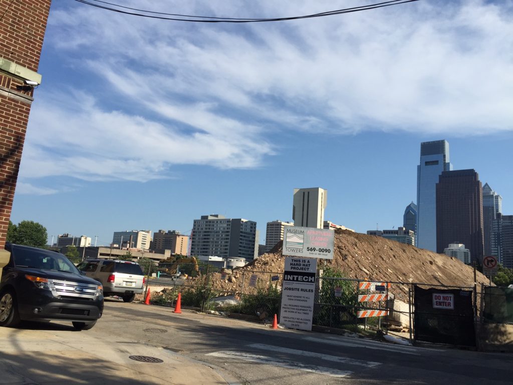 Museum Towers II has been a long time coming. It was way back in January of 2012 that we first told you that the surface parking lot between 18th & 19th, Buttonwood Street & Mattias Baldwin Park would be replaced by an apartment tower and some town homes. At that point, developers Forest City were still in the process of meeting with the Logan Square Neighborhood Association regarding the project. It finally went to Civic Design Review at the beginning of 2014, but the lot remained in use for many months afterward. Passing by over the weekend, we discovered it's now a construction site and probably has been for a couple months.