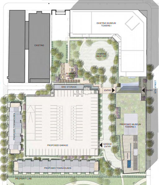 The project will include a sixteen-story apartment building with 270 units and a four level parking garage with 439 parking spaces. That's roughly an additional 150 spaces over the surface lot that's getting replaced. Wrapping around the parking garage, look for sixteen townhomes which we'd imagine will be offered for sale. Eh, rentals could work too. Here, check out the site plan to see how the new buildings will interact with each other and with the existing buildings.