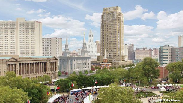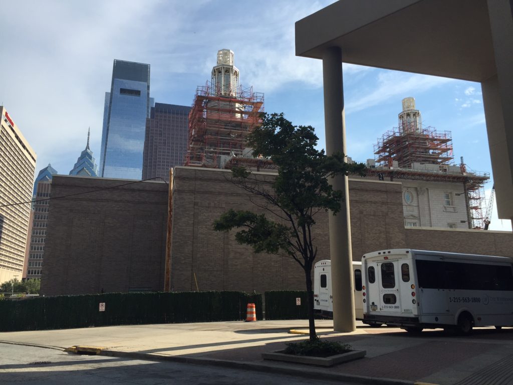 The project next door won't strike nearly as interesting a figure on the skyline, but it will have considerably more impact on Philadelphia's non-Mormon population. Remember, we told you back in the winter of 2014 of plans from the LDS church to build a mixed-use project on the lot immediately to the east of the temple. That project will entail a 32-story residential tower containing 258 market-rate apartments along with a handful of townhomes. It will also include a public meetinghouse and ground-floor retail. As we said before, we would be surprised if any of the commercial tenants serve coffee or alcohol.