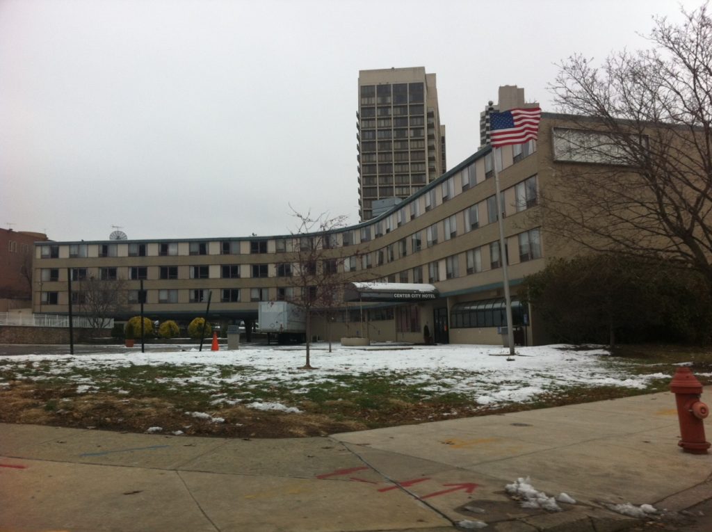 If you look carefully at the photo above, you'll notice that the Best Western name has been covered over on the awning, leaving a generic "Center City Hotel" sign above the former entrance. But this awning, like the rest of the building, will soon disappear. In its place will rise this building: