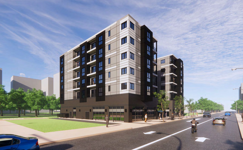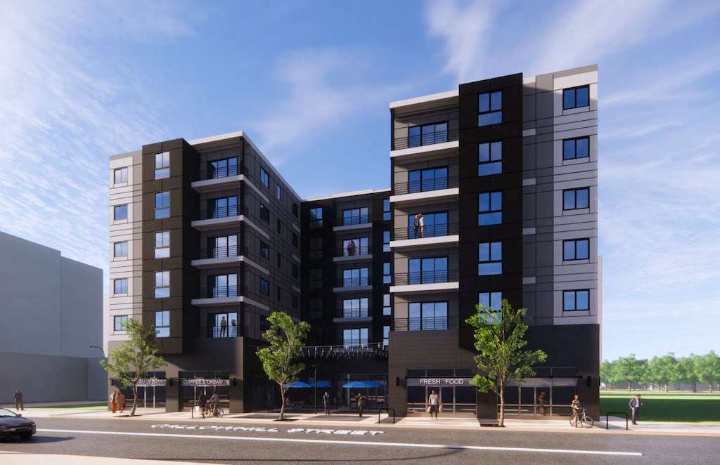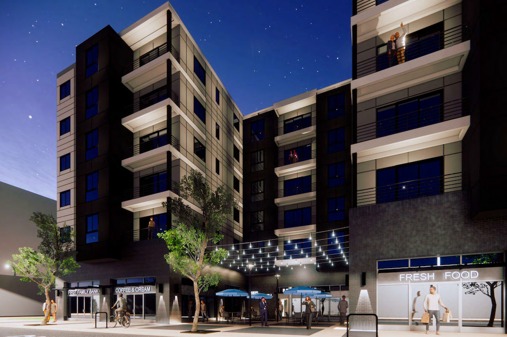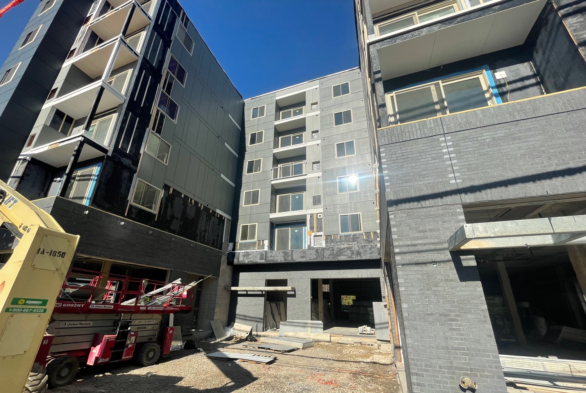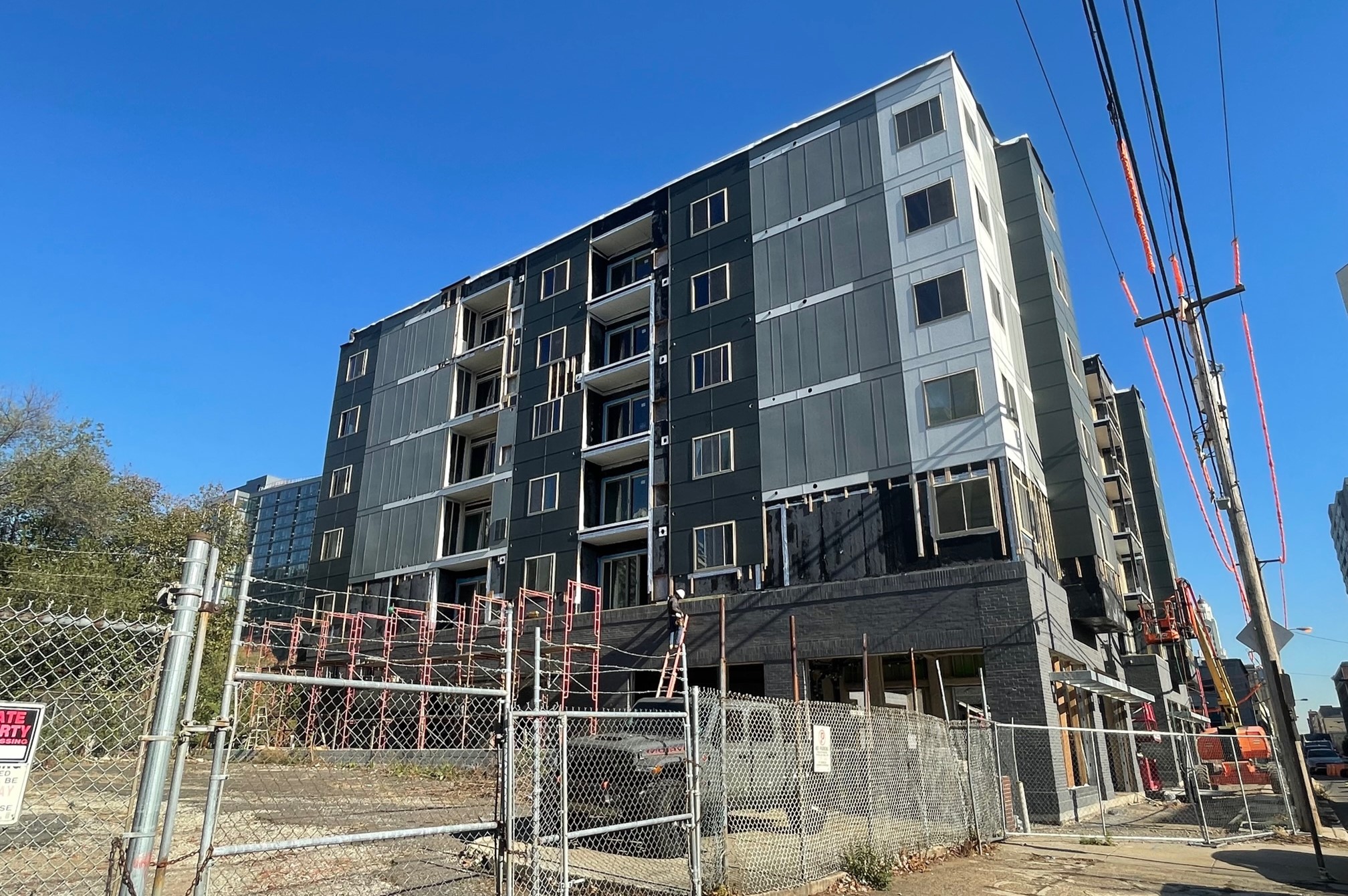 We checked in back in March, when signs of verticality were just starting to show for this project. Things have clearly been moving since then for this project from Orens Brothers, as the building is topped out and most of the upper facade is installed. Work is still very much on-going, and you can see it start to resemble the design from Wulff Architects, which has utilized a modular construction approach. A fresh food grocer and two other retail spaces will take up the ground floor, continuing the recent retail trend for this property, which was home to a beer garden a couple summers back.