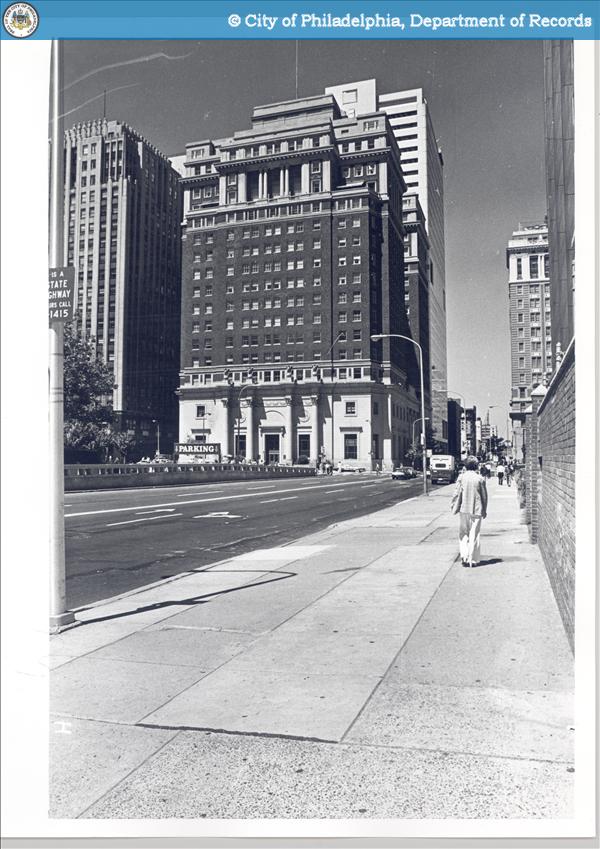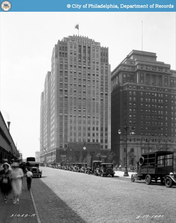 By 1917, according to Wikipedia, construction had begun on the Champs-Elysees-inspired Parkway. Countless attractions and places of business sprouted around it. One such place was the Insurance Company of North America. According to the National Historic Landmarks Program, in 1925, 1600 Arch became the new home to the oldest capital stock insurance company in the U.S., celebrated for its pioneer work in marine underwriting. The corner once known for its ‘reductions’ was now occupied by a massive steel structure. From its new location, the INA would weather the Great Depression while many of its emergent competitors floundered. The Department of Records image here below shows the building during the lean years. Note the brand spanking new Suburban Station just next door.
