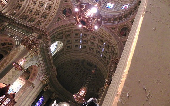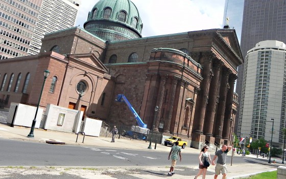 Since it was completed in 1864, rain, sun, wind and snow have worn down the façade and ornate plasterwork at the Cathedral Basilica of Saints Peter and Paul, the main church of the Archdiocese of Philadelphia at 18th Street and the Parkway. Now is the time for a five- to seven-year $28M renovation project (funded by an Archdiocesan Capital Campaign) to rehab the site modeled after the San Carlo al Corso Church in Rome, as needed, inside and out. Sometime this month scaffolding will go up along the front of the building for masons from Vitetta to begin testing the faded-to-pink brownstone originally hauled to the Logan Square holy site from Connecticut and northern New Jersey, for structural integrity, according to Rev. Msgr. Arthur E. Rogers. Upgraded to the honor of Basilica in 1976 by Pope Paul VI, the structures’ statues of Saints Peter and Paul, the Sacred Heart and the Blessed Mother will be refinished and reinstalled in their current niches outside the building. Additional work includes roof repairs and the installation of a 21st-century heating and cooling system. Renovations will refresh the cathedral’s Roman-Corinthian interior and 60-foot copper dome.