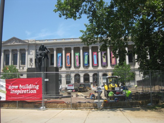With an expansion set to begin in about two years, The Philadelphia Free Library at 1901 Vine St. has been undergoing much-needed renovations in the past months, and we’re starting to see some real progress. Funded by State dollars, exterior renovation work includes facade cleaning and re-pointing, window replacement, brass door cleaning and polishing, dealing with some long-time drainage issues, and dramatically improving Shakespeare Park. The park, which sits directly in front of the library and floats above I-676, was in need of some serious TLC with cracked pavement, patchy grass, and lights that seemed ready to fall over.