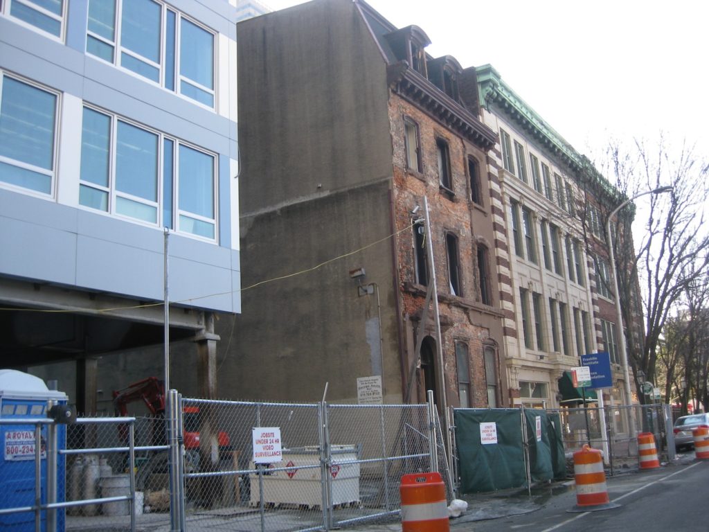According to Hidden City, the Francis McIlvain House was built in 1869, and designated historic in 1979. PMC Property Group is responsible for the demolition, and are likewise responsible for the new building going up next door. Are they demolishing this building to give their new structure additional room to breathe? Or to create a wider drive-aisle into a parking garage? Or is there perhaps some other plan for the lot upon which this building (still barely) sits?