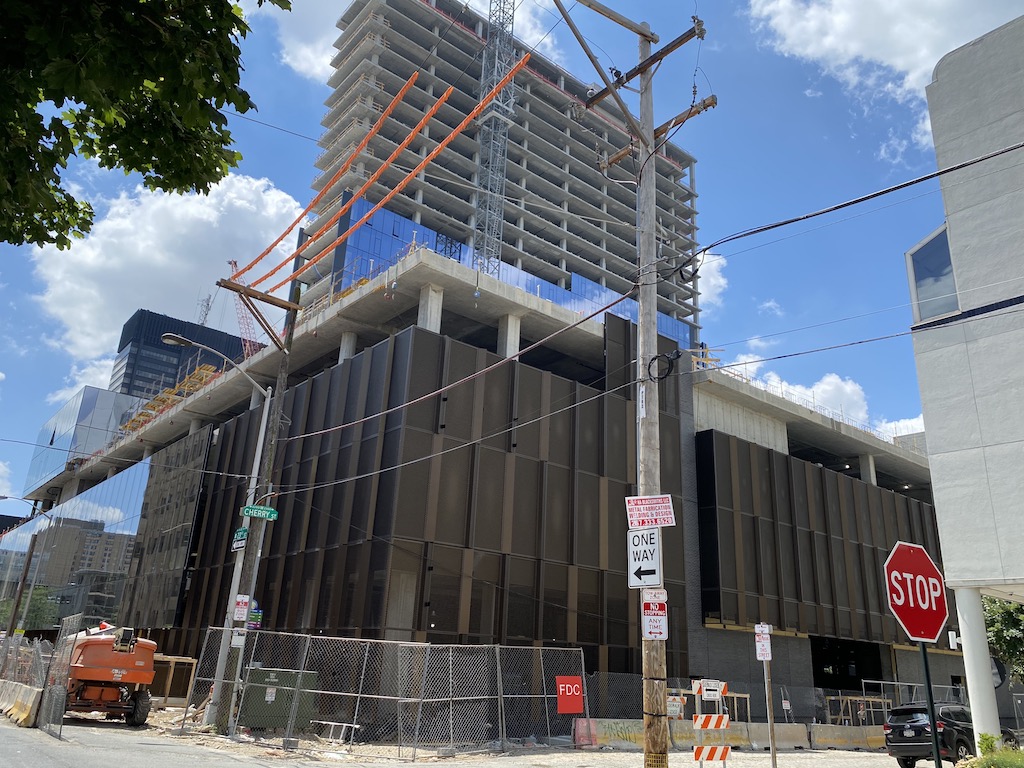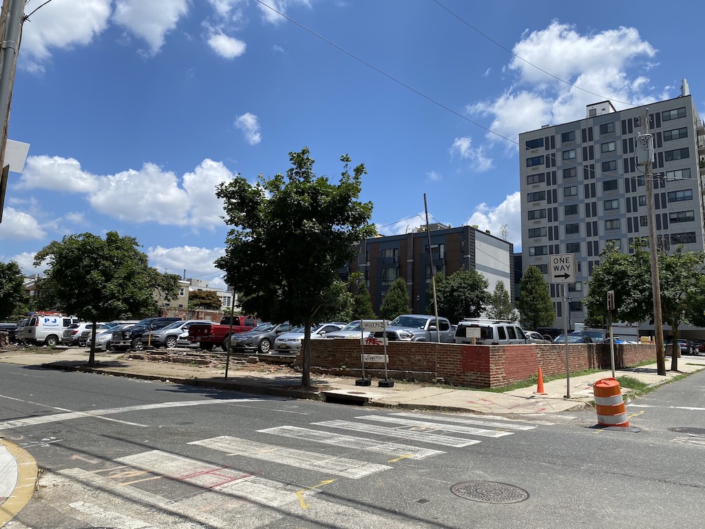 The Riverwalk project has sprouted on the southwest corner, representing the largest project in the neighborhood in decades (maybe ever?). As you might expect, the project has evolved since we first brought it to your attention a few years ago, and the current plans call for 711 apartments (up from 612) between two towers. The northern tower, which is progressing nicely and can be seen in the image below, sits on a large retail space which will house a Giant location. The southern tower is likely a couple years behind, but that’s okay when you consider how much this project upgrades what was previously a huge surface lot.