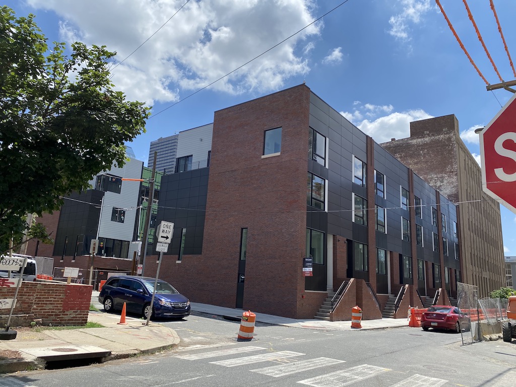 On the southeast corner is the Logan 23 development, on the site of the former Cresswell Iron Works. As we told you when we checked in on this project last fall, US Construction is building 16 homes here, with prices starting at $1.8M. It appears that the first row of homes is finished and the second row isn’t far behind. Remarkably, this is the smallest project of the group at this intersection.