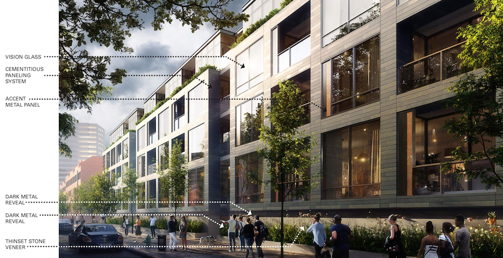 The plan calls for a four story building with a total of 115 units and 42 parking spots, with most of the parking underground. You might think that retail would make sense here and we might be inclined to agree, given the number of units in the building and the numerous apartment buildings existing and upcoming nearby. But as we said, the project is happening by right, and the parcel is zoned for multi-family use for some reason, so any efforts by the developers to build something taller or with retail would require a visit to the ZBA, so we can understand why they wouldn’t want to go down that path. Still, we’re pleased as ever to see something replace a surface parking lot, and we’re positively delighted that the new building will look something like the renderings above- for a simple four-story apartment building, the design work looks like it will be unusually strong. Density and good design in one shot, be still our hearts.