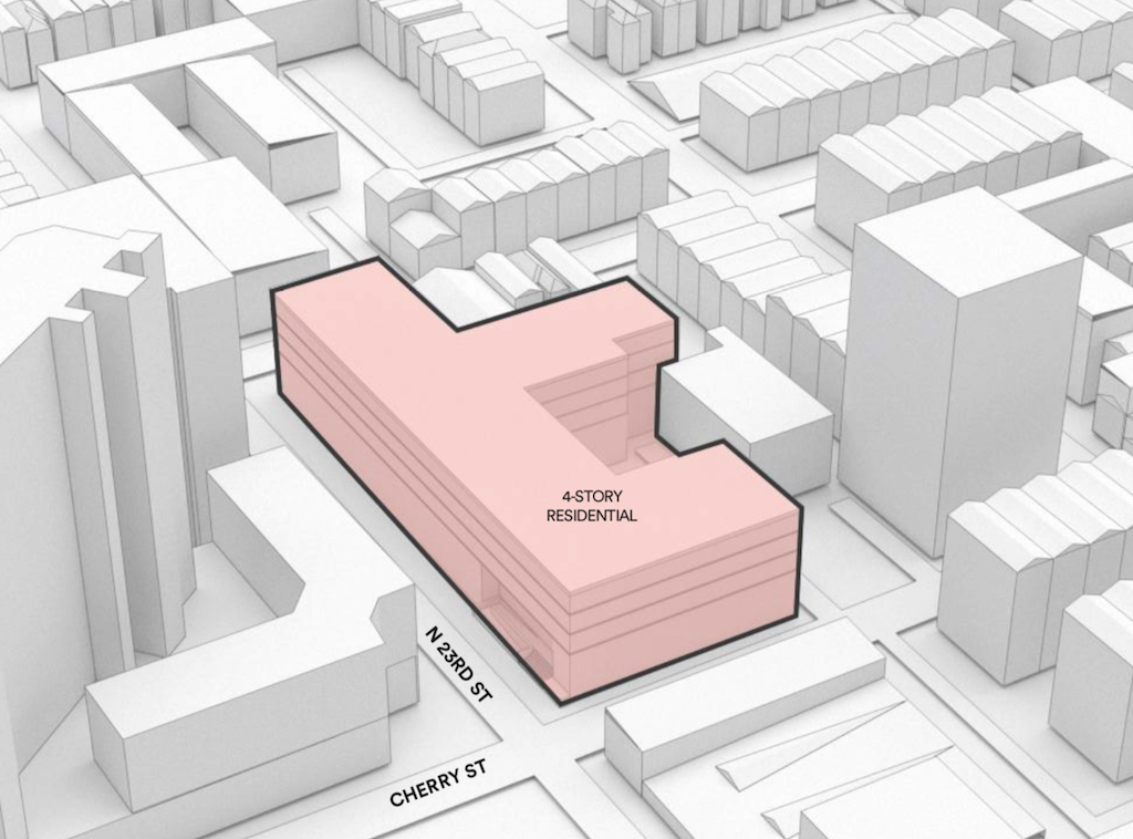 As we mentioned, US Construction is building the Logan 23 project, and you may recall the same developers were previously looking to develop the parking lot on the northeast corner of 23rd & Cherry. Back in 2016, we told you about a plan for 26 homes which was pretty far along, but the developers ultimately decided against building. In a fascinating development, PMC Property Group, the same company building the Riverwalk project, has snatched up this property and is now pursuing a by-right development to build an apartment building. The plan goes to Civic Design Review this month, so we’re able to share some renderings, with credit to SCB for the design work.