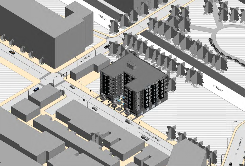 In 1949, an orphanage appeared at 1823 Callowhill St., in a building designed by Elizabeth Fleisher. Fleisher is the first known woman architect in Philadelphia and also was involved with the design of the Parkway House, incidentally. The building later was home to the Children’s Crisis Treatment Center, which moved several years ago to a space on Delaware Avenue. In 2015, we told you that the City had sold the property to Orens Brothers, and the developers intended to demolish the building and replace it with a small apartment building with 32 units and a microbrewery. By the end of the next year, the building was gone and we found some renderings from Wulff Architects.