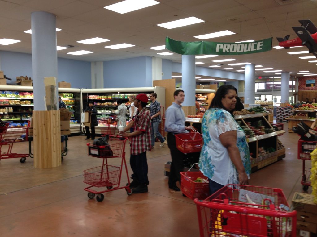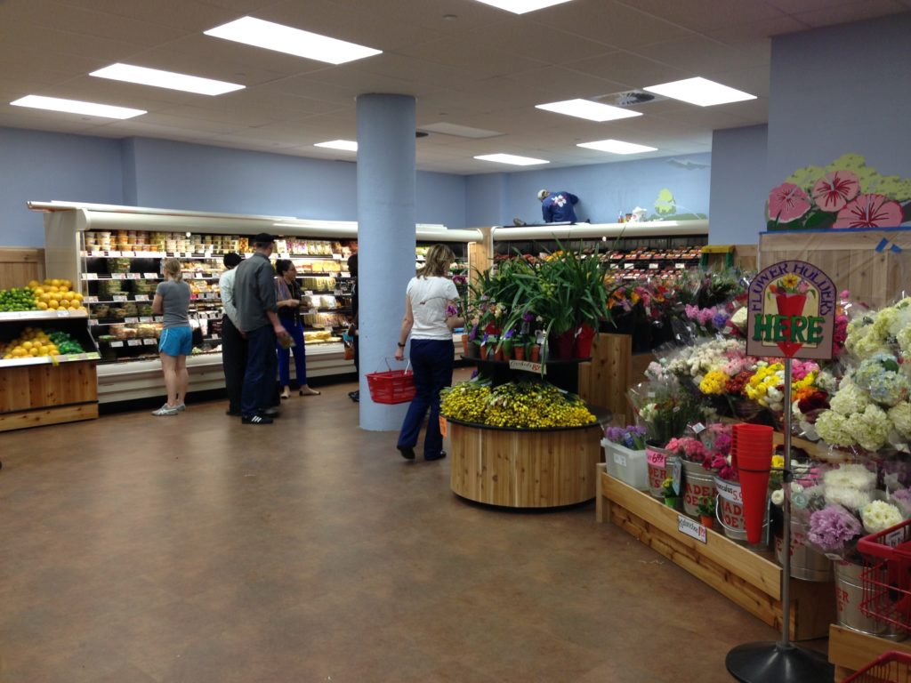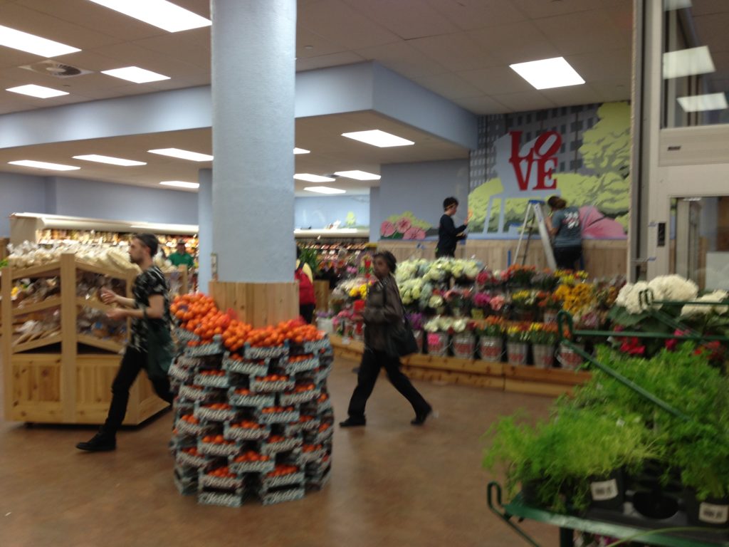 All seems the same from the usually-jammed parking lot, but as you enter into what used to be an enclosed foyer of mixed bouquets and cinnamon brooms you now face doors for cart traffic in and out, and an open expanse of the bright store. The flower market leads you in and to the right, which is all new space taken from what was previously offices along 22nd Street. Your fresh meats, tortellinis and prepared foods are at the ready, along with a baker’s shelf full of fresh bread. Fruit stands are open and accessible by the snacks and chips, and your neatly wrapped produce and cheeses remain in the same spot at the back of the store in the refrigerators lining the walls, but with a wide open floor plan to navigate more easily. Muralists were working during the lunchtime rush to get Philly scenes and some springtime onto the bare walls.