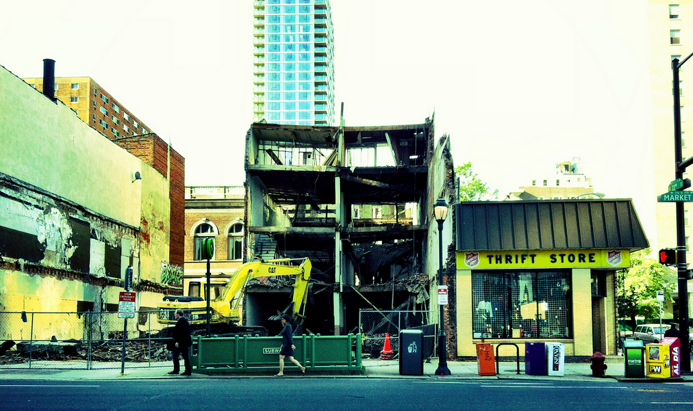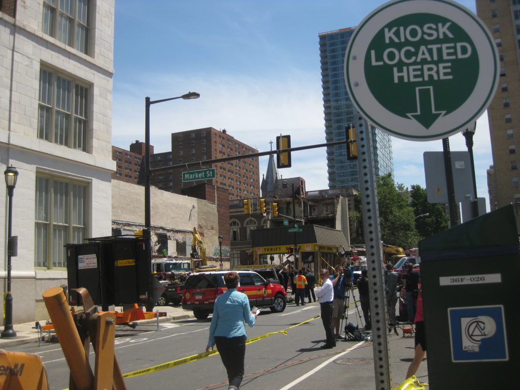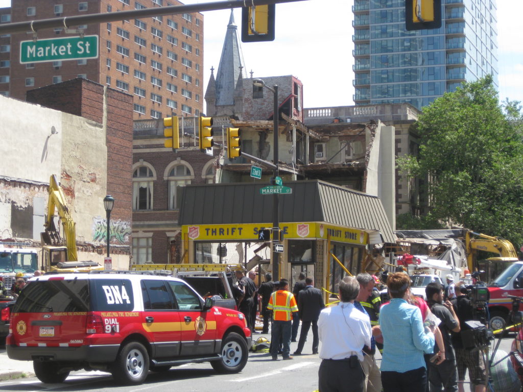 Back in February, we updated you on the ongoing demolition at the old Forum Theater and told you about upcoming plans to demolish three structures on the south side of the 2100 block of Market Street. Those buildings, previously home to Les Gals and Hoagie City, have been undergoing demolition for the last several weeks, until today when the Hoagie City building collapsed. The collapse not only brought down what was left of the Hoagie City building, but it also took out the Salvation Army building, located on the corner of 22nd & Market. There was apparently a demolition crew inside the Hoagie City building, and employees and shoppers inside the store when the building came down around 10:40 this morning.
